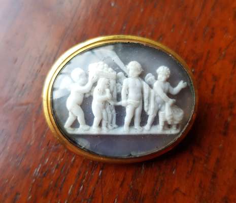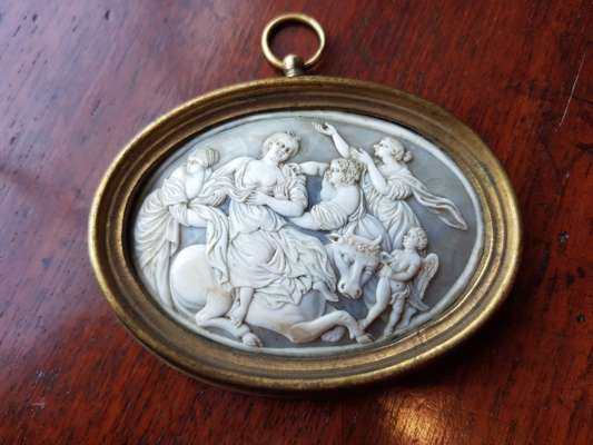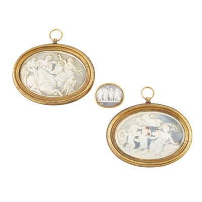 of oval form, in gilt bronze frames, depicting Europa and the Bull and Harmonia and the Serpent, 8cm wide; together with a ROMAN HARDSTONE-CARVED CAMEO, in a later gilt mount, fitted as a brooch, depicting putti with fruit, 3cm wide