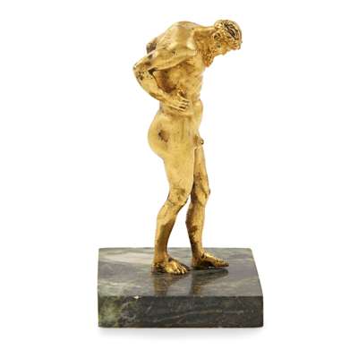 The statuette, which appears to be un-published, shows analogies with others of roughly the same scale and similarly gilded that are usually attributed to Campagna, such as kneeling or standing youths or older men holding up shells to act as a salt-cellars or sweetmeat dishes (see Philippe Cros, Fondation Bemberg, Bronzes de la Renaissance Italienne, Toulouse / Paris, 1996, pp.62-64).