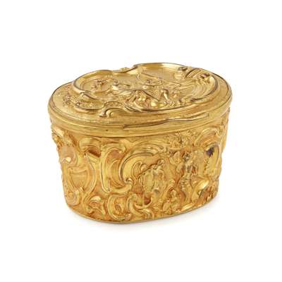 of oval outline, depicting Cronus and Rhea within a C-scrolled border, above the slightly tapered base with further scenes amongst rococo C-scrolls, opening to a void interior