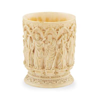the hollow carved tusk depicting the twelve Apostles on plinths inscribed with their names, below lancet architectural arches with signs of the Zodiac, raised on an oval foot, with a crest to the underside and date 1657