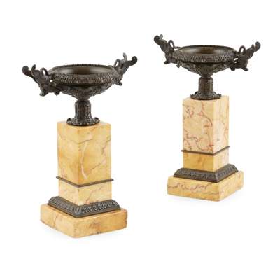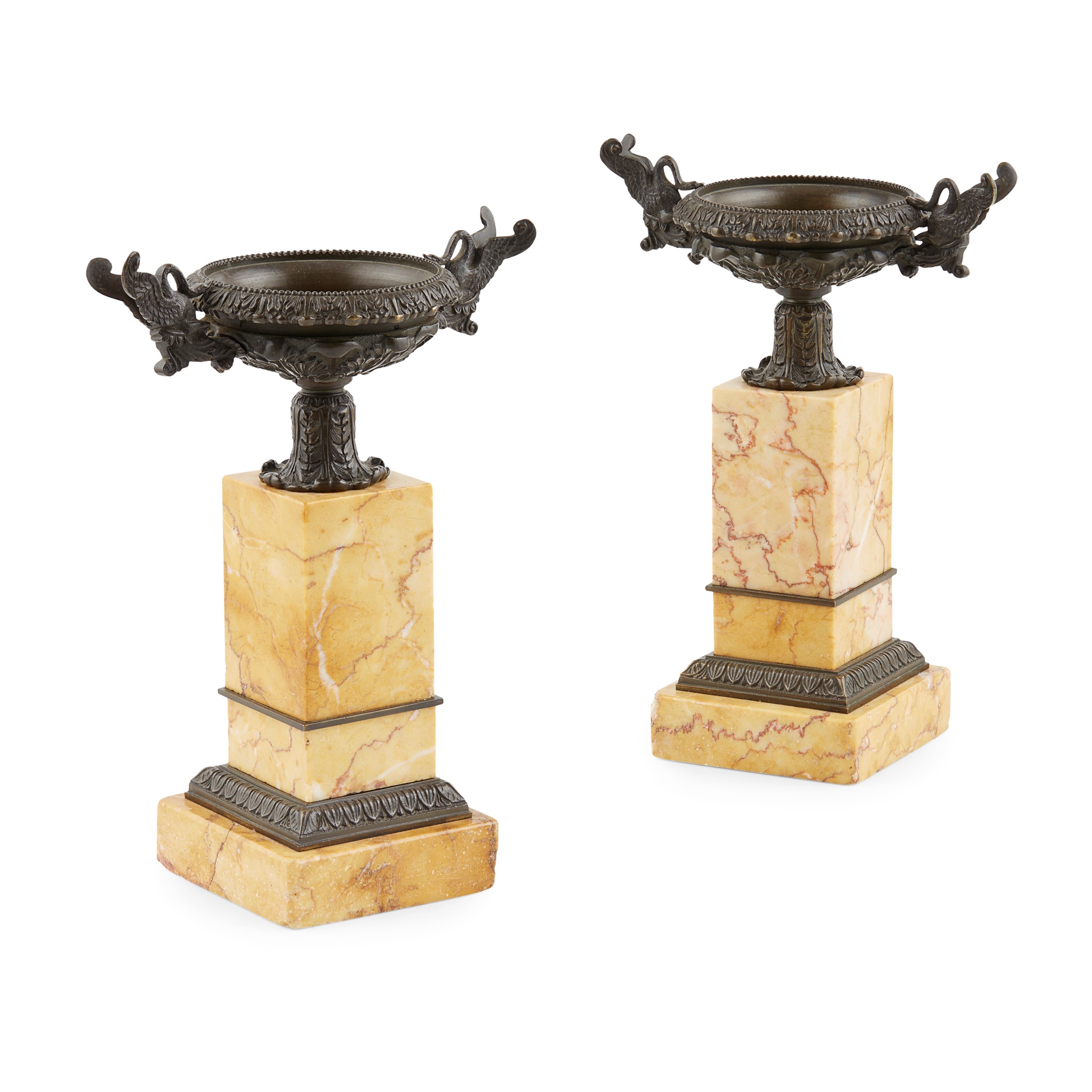 PAIR OF CHARLES X BRONZE AND SIENA MARBLE URNS
