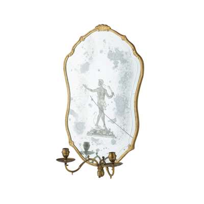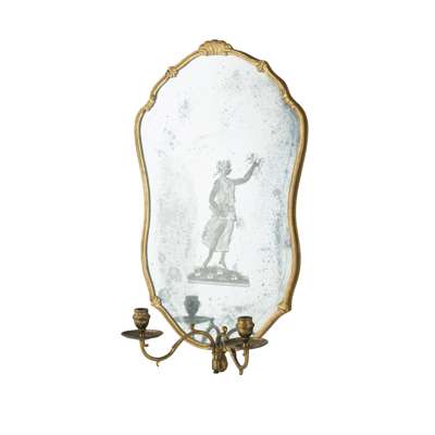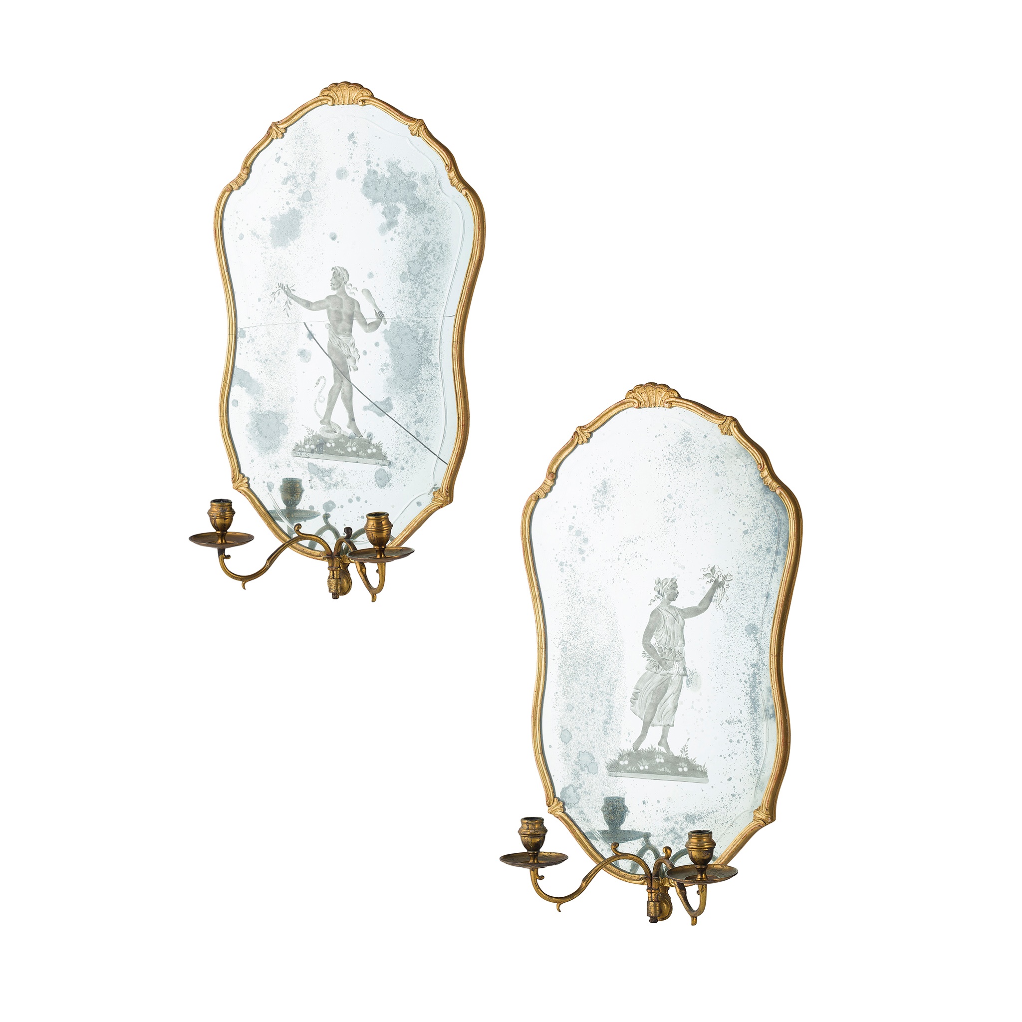 the cartouche-form mirror plates engraved with a male and female figure in Greek attire, within moulded giltwood frames fitted with two outscrolling gilt metal candle arms each