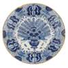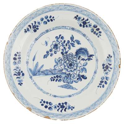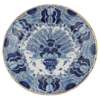 comprising five chargers, including one polychrome example; two blue and white 'Peacock' pattern dishes by The Claw (De Klauw) Factory with maker's marks and initials L.S.; and a two blue and white examples with peonies, largest 35.5cm diam.; together with two smaller plates, also in blue and white, one decorated with peonies, the other a leaping stag, 23cm diam.