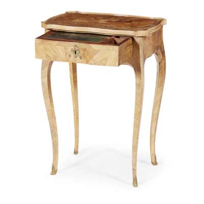 the shaped rectangular top with strapwork and floral marquetry, above a frieze drawer fitted for writing, raised on square cabriole legs with gilt bronze sabots