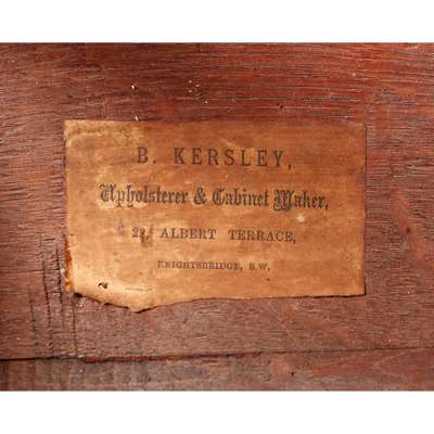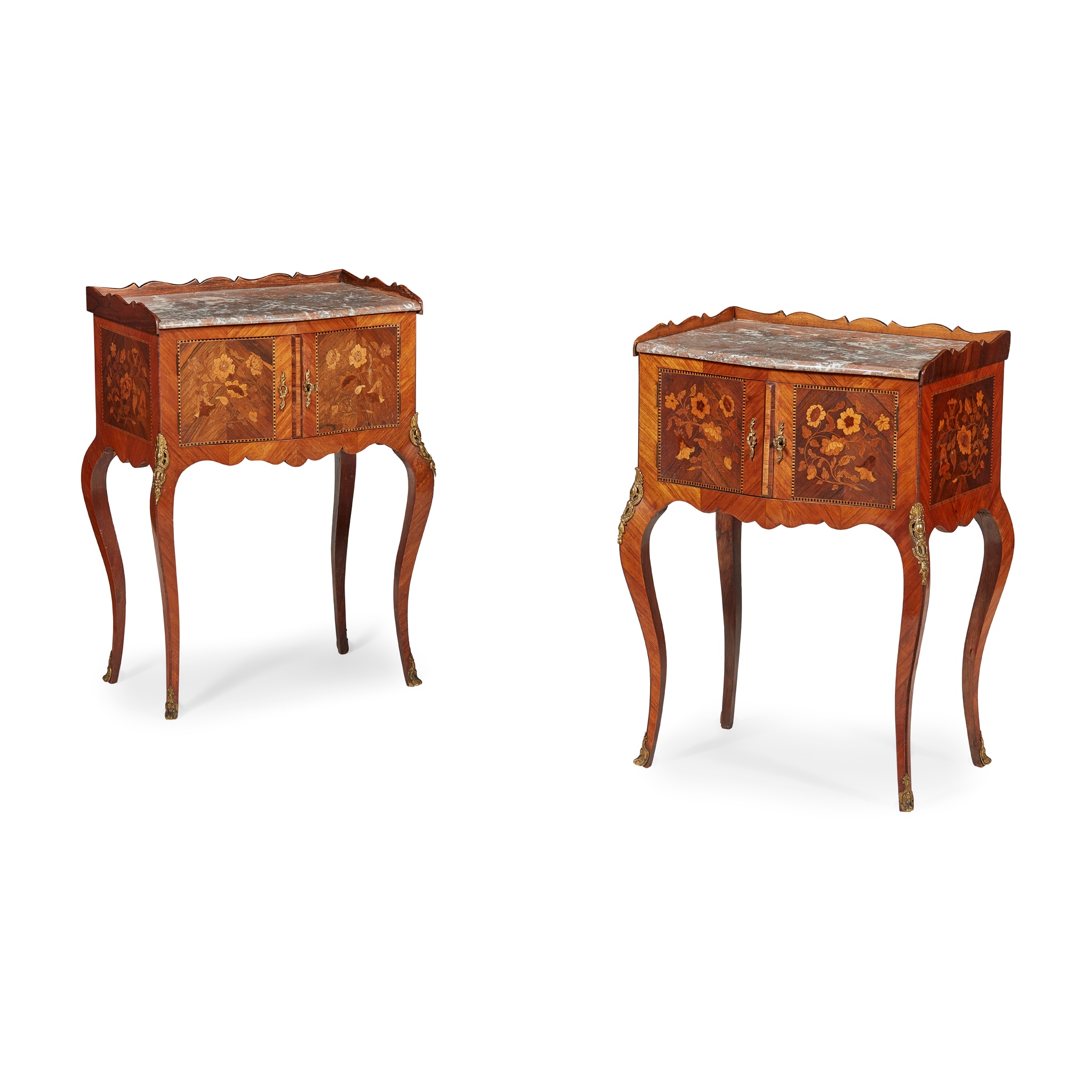 the serpentine breche marble tops with three-quarter galleries, above a pair of doors with floral marquetry, raised on squared cabriole legs with gilt metal mounts, bearing paper trade label R. KERSLEY, Upholsterer & Cabinet Maker, 22, ALBERT TERRACE, KNIGHTSBRIDGE, S.W.