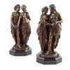 with golden brown patina, each depicting entwined lovers, signed BOURET, raised on chamfered black marble bases with gilt borders
