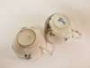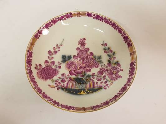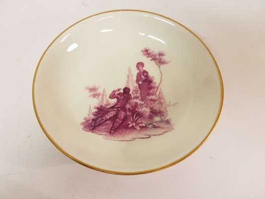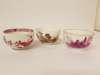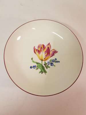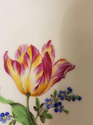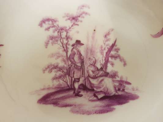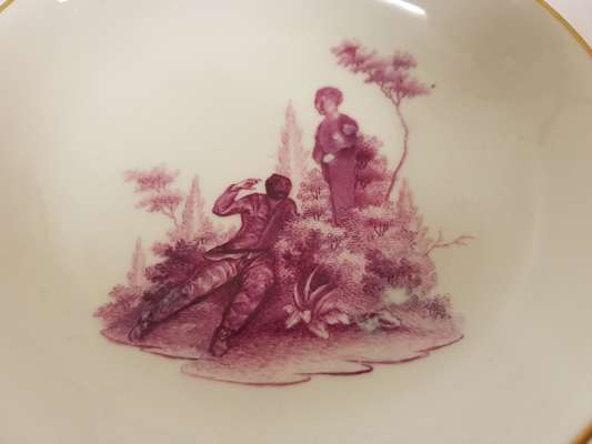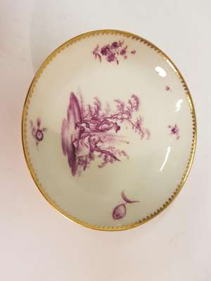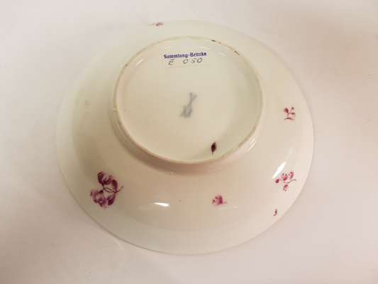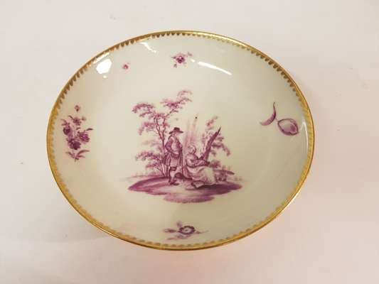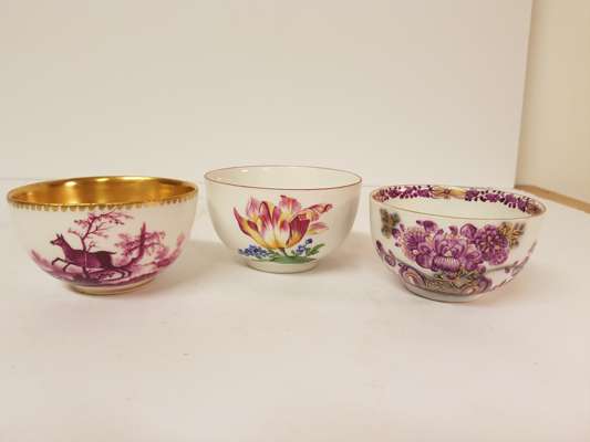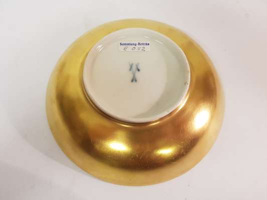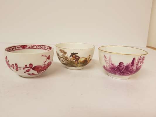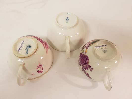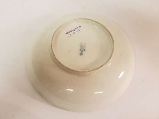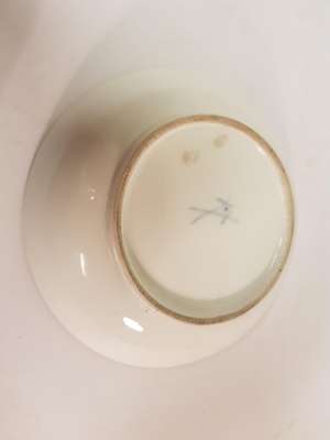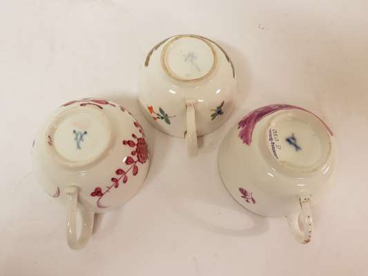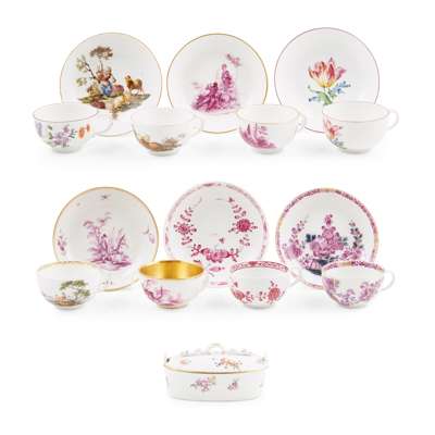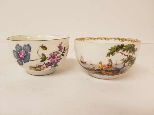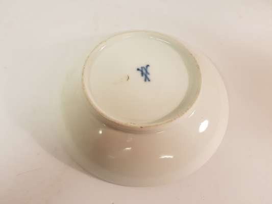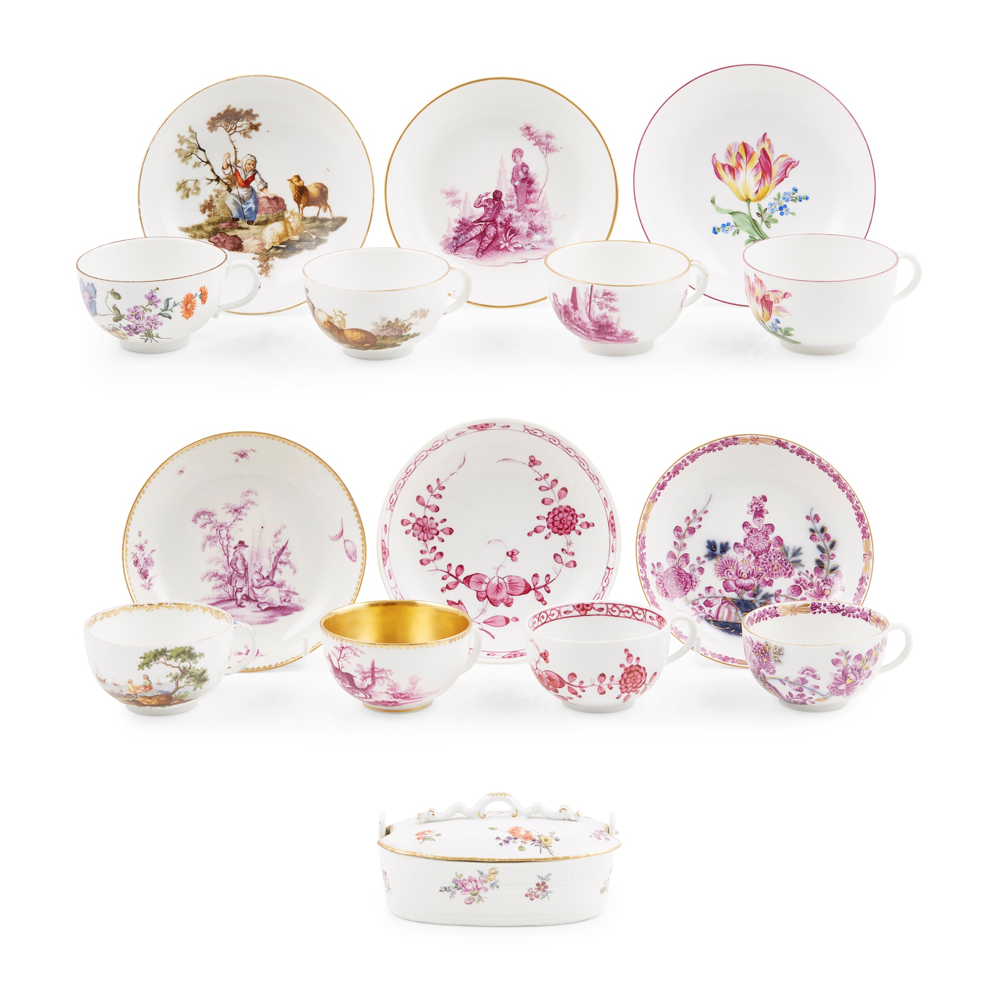 all with underglaze blue crossed swords marks, comprising six teacups with matching saucers, variously decorated with flowers and figures, including a Marcolini set; and two further teacups one decorated with flowers, the other a seascape; and a covered box, with basket-weave border and painted with floral sprigs