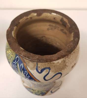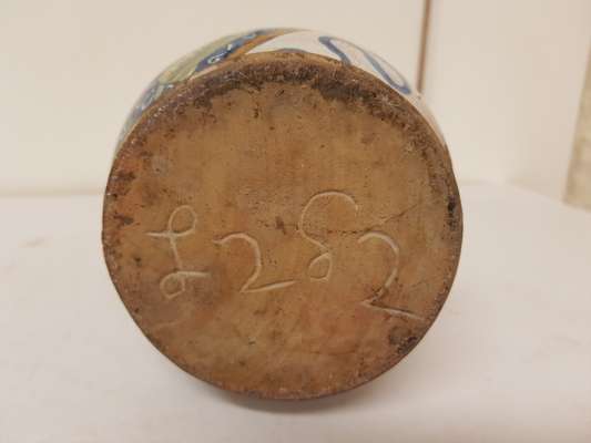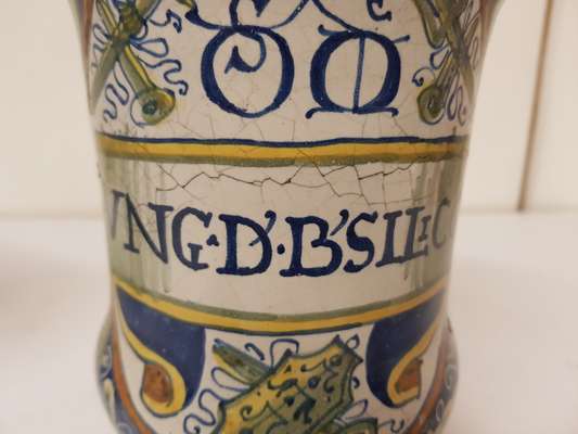 Note: The emblem depicted on the albarellos is still to be found on the buildings which were formally the Hospital of Santa Maria della Misericordia in Perugia. The surviving hospital account books note in 1565 payment for a set of pharmacy vases from the Perugian potter Andrea di Marco di Iacopo delle Scine. These albarellos belong to this commissioned set. Eight others are recorded. Four spouted jars - one in the Castello Sforzesco, Milan, dated 1565, one in the collection of the Fondazione Cassa di Risparmio in Perugia, two in private collections, one in Ostra, one in Assisi (Giulio Busti and Franco Cocchi in La Via Della Ceramica Tra Umbria e Marche: Maioliche Rinascimentali da Collezioni Private, 2010, ed. Ettore A. Sannipoli, cat1.23, p104.). Four albarellos similar to these exist, two in the Bagatti Valsecchi Museum Milan, and two, both dated 1565, formerly in the Della Gherardesca Collection (Finarte, Milan, 21-22 Nov, 1963, lot 65).