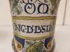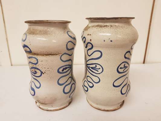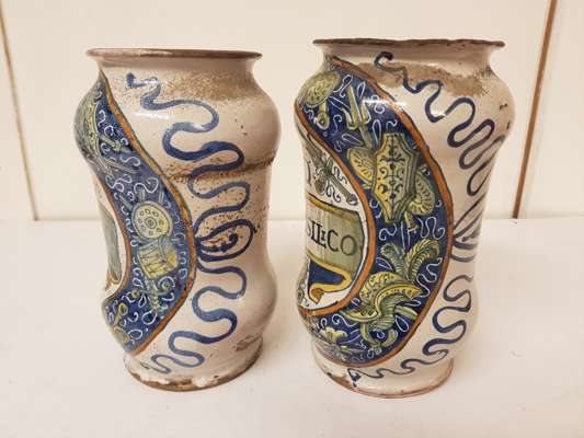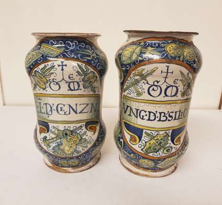 the cylindrical bodies with swelling at the shoulders and bases, and decorated with bands of yellow armorial trophies on dark blue grounds, enclosing central oval reserves depicting the emblem Ds ME (for Domus Misericordiae House of Pity) surmounted by crosses flanked by trophies, with inscribed labels, the first EL. D.’ GENZNA, the second UNG. D’. B’SILICO, with incised symbols to the base, the first L2 d2 (for ‘libbre’ (pounds) and ‘once’ (ounces), possibly equating to 792.5gm its modern weight when empty), the second L2 d6 (possibly equating to 937.3gm, also its modern weight when empty)