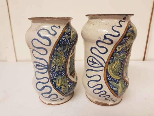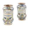 PAIR OF UNRECORDED ITALIAN MAIOLICA ALBARELLOS, FROM A SET OF PHARMACY JARS BY ANDREA DI MARCO DI IACOPO DE LE SCINE