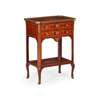 in the Transitional style, the brass-banded top with floral marquetry and outset canted corners, above two drawers between angles with chutes and line inlay, linked by a lower tier with conforming marquetry, on slightly hipped legs with sabots