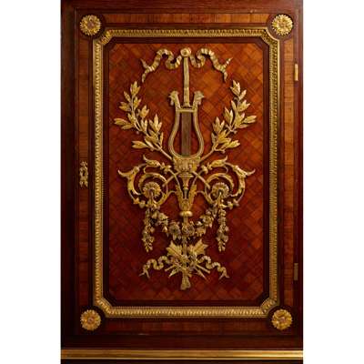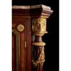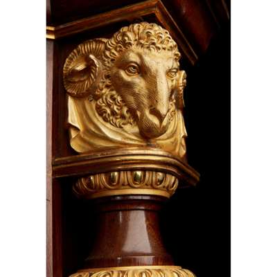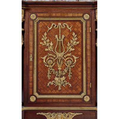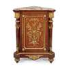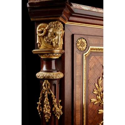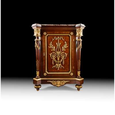 the breche d'alep marble top with outset corners above a parquetry door with lyre scroll and foliate mounts, opening to an adjustable shelved interior, flanked by fluted columns with ram's head mounted capitals, the whole raised on a plinth with turned and tapered feet, stamped twice under the marble GROS, PARIS