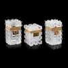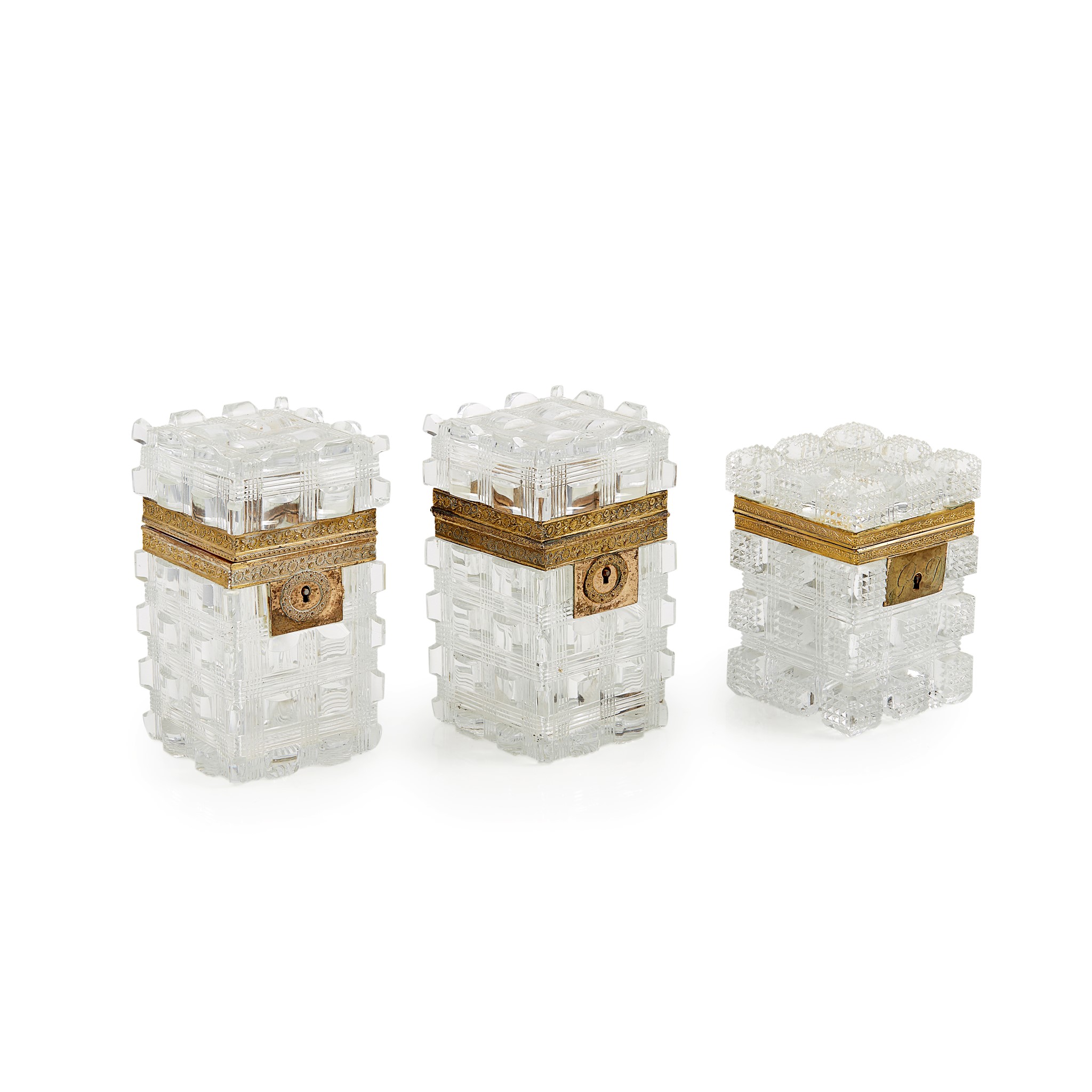 all of cubic form with gilt copper mounts, comprising a pair with polished glass panels amongst line-cut borders, 7.5cm wide, 13.5cm high, 7.5cm deep; and a single smaller example with strawberry-cut panels, the escutcheon engraved GD, 8cm wide, 11cm high, 8cm deep