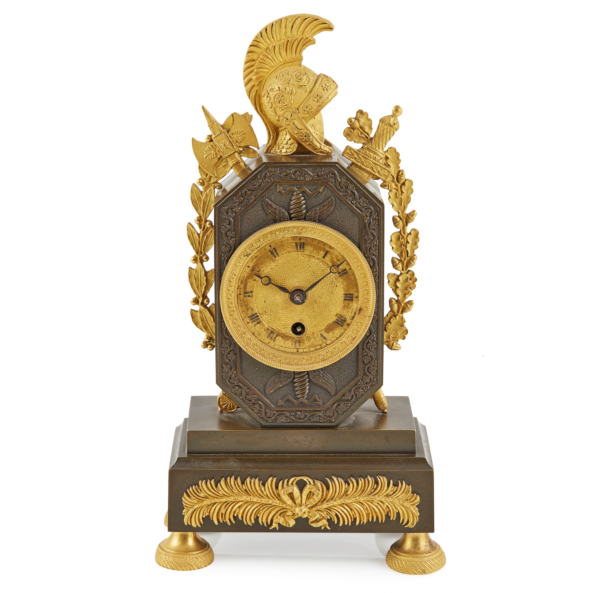 the octagonal case surmounted by a plumed helmet, sword and axe with oak leaves, acorns, olive leaves and fruit, above the gilt dial with Roman numerals, raised on a stepped base with feather-form mount and engine-turned feet; the non-striking timepiece movement with silk suspension stamped 1061 BUTTE