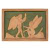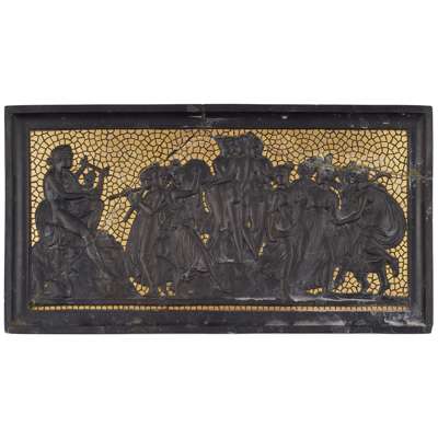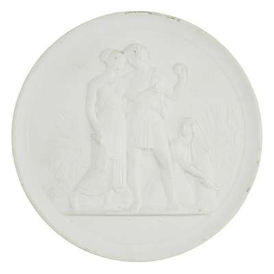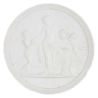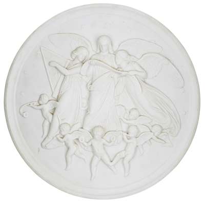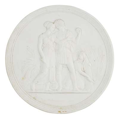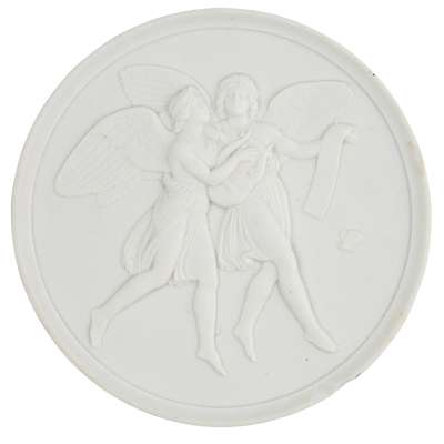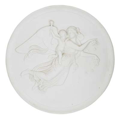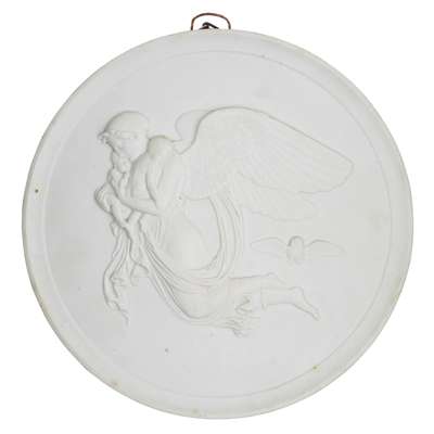comprising three large Bing & Grondahl roundels, with moulded borders and scenes after Bertel Thorvaldsen, including 'Day' and 'Night', 29cm diam.; and 'Christmas Joy in Heaven', 33cm diam.; impressed maker's marks B&G/ ENERET/ C; and ten smaller plaques, depicting Classical figures, comprising three Royal Copenhagen bisque roundels, and a Bing & Grondahl roundel of similar form, largest 14.5cm diam.; two P. Ipsen terracotta rectangular plaques, 28.5cm wide; a similar P. Ipsen bisque plaque, 26cm wide; a smaller plaque with green painted ground, 15.5cm wide; a P. Ipsen basalt plaque with gilt ground, 24.5cm wide; and a L. Hiorth bisque plaque with maroon ground, 30.5cm wide; various impressed and incised marks