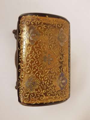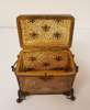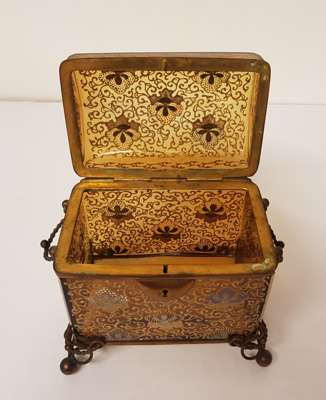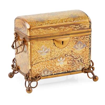 of rectangular domed form with gilt brass handles, the hinged lid opening to a void interior and marked 1., decorated with stylised enamel orchids on scrollwork, on open wirework ball feet