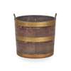 of cylindrical staved form with twin brass loop handles and three brass bands