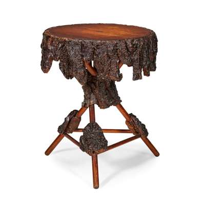 the circular top with an applied bark apron, raised on turned tripod legs linked by stretchers and with further applied bark embellishments