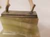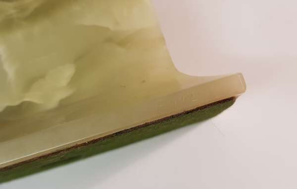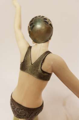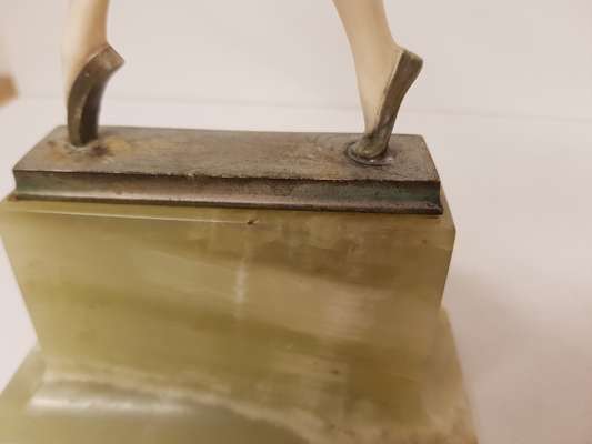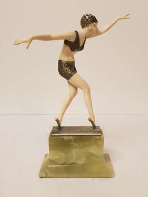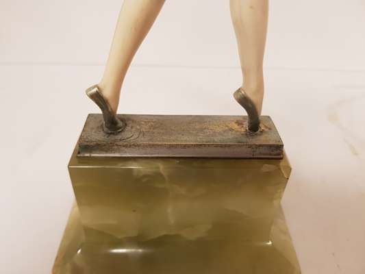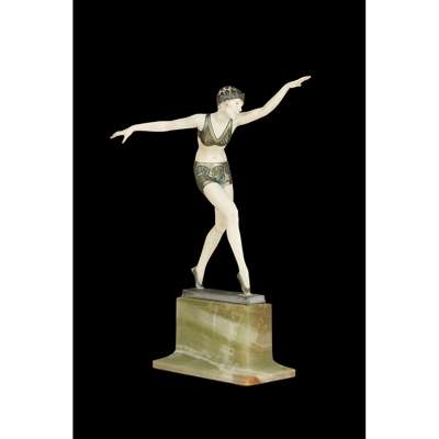 the figure standing on tip-toe with arms outstretched, on a silvered base raised on a green onyx plinth base, etched inscription F. PREISS