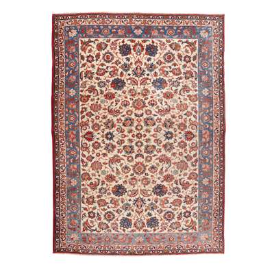 the ivory field with allover palmette and foliate vine pattern, within blue palmette and vine border