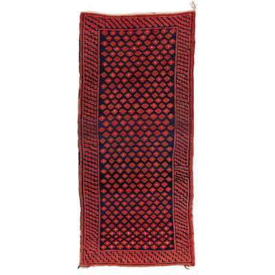 the indigo field with allover red lozenge pattern, within red stepped diagonal stripe border