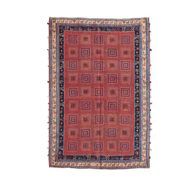 the red field with allover square rosette pattern, within double indigo and cream animal borders