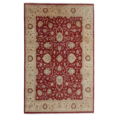 the abrash rust red field with allover palmette pattern, within cream palmette border