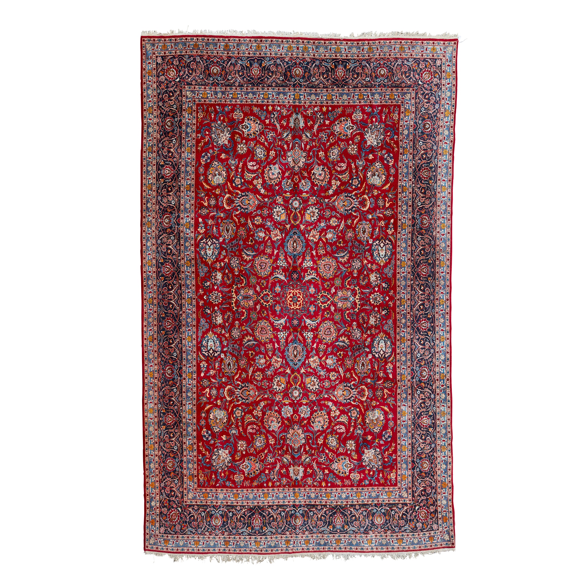 the crimson red field with allover palmette and foliate pattern, within indigo palmette and arabesque vine border