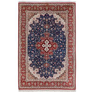the blue field with cusped red medallion, cream and brown spandrels, within red palmette and vine border, signature to one end