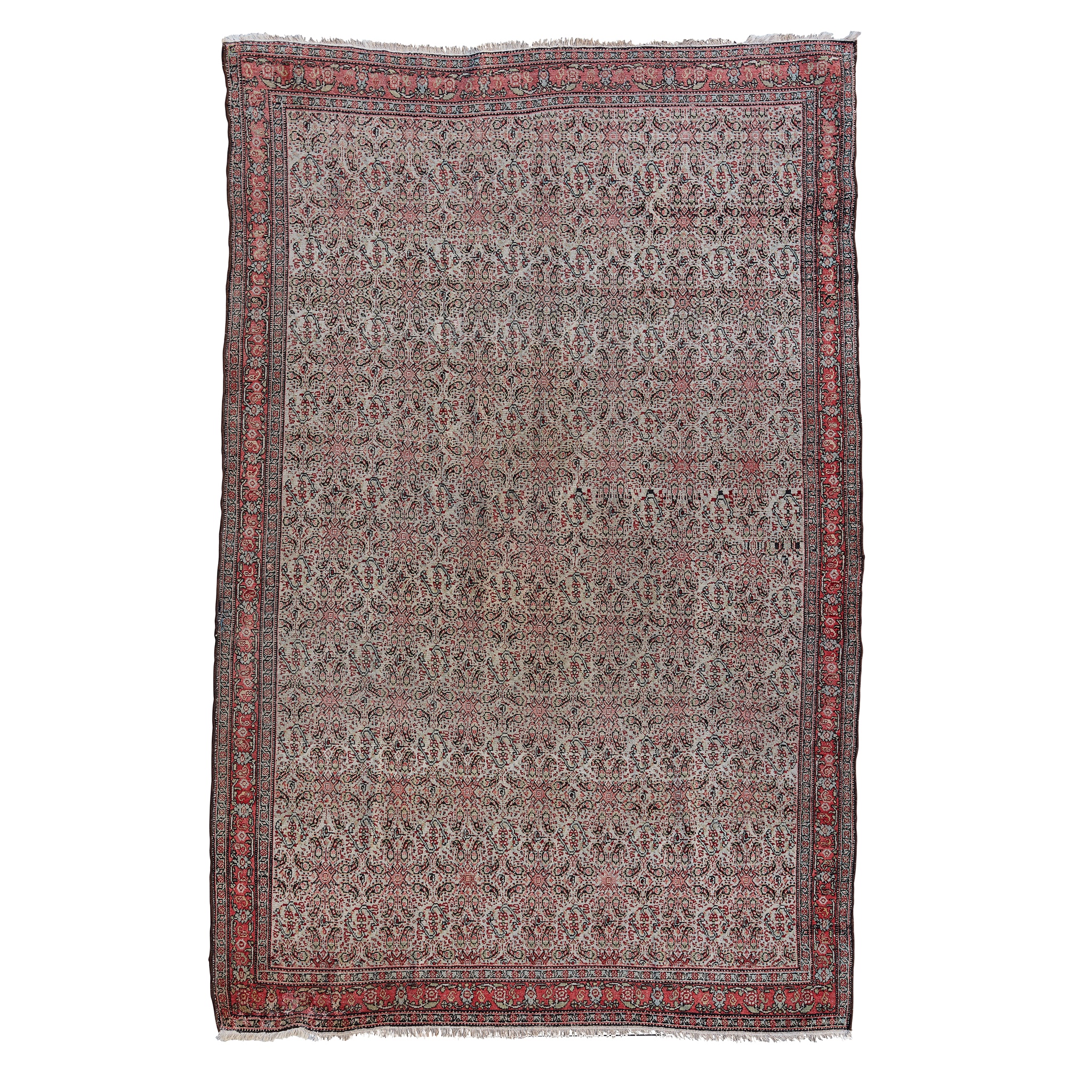 the cream field with allover boteh pattern, within narrow pink stylised vine border