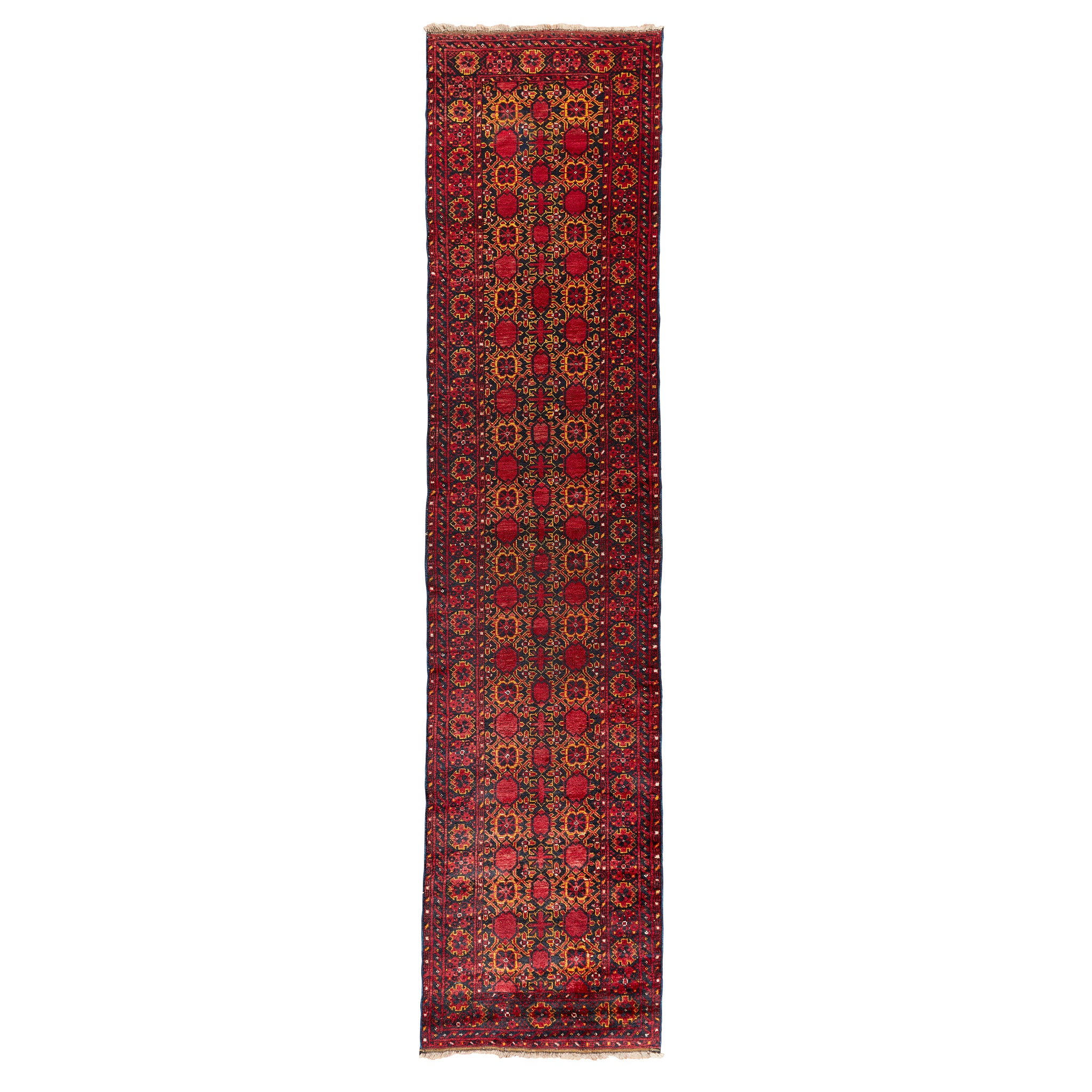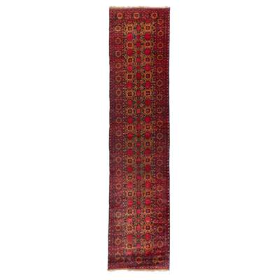 the dark brown field with allover red and orange stylised rosette lattice pattern, within dark brown rosette border