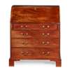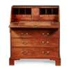 the figured slant front opening to a leather insert and an arrangement of pigeonholes and drawers around a central cupboard, above four long graduated drawers, raised on shaped bracket feet