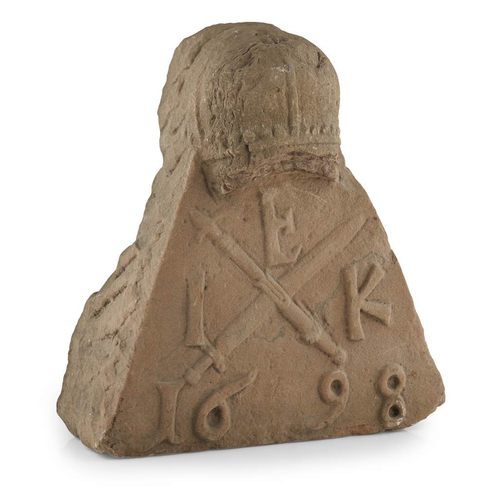 of triangular shape, with crossed sword and pike, and initials I E K, dated 1698 below, surmounted by a coronet