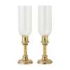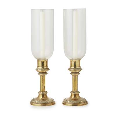 with cylindrical glass shades on brass candlestands with repouse knops and domed feet, with maker's labels