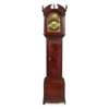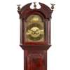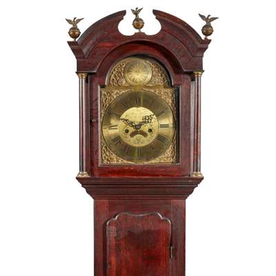 the moulded broken arch pediment with brass eagle finials above an arched brass dial with Roman and Arabic chapters, with a calendar aperture and inscribed SAML. BURTON/ MORLEY, above a shaped trunk door and plinth base with bracket feet; the eight day twin train movement striking a bell