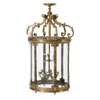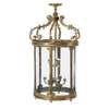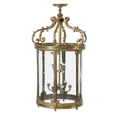 the corona with six scrolling supports above six cylindrical glazed panels in a laurel cast frame enclosing two tiers of candle arms for nine lights, electrified
