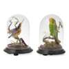 comprising a kingfisher and a lovebird, each on branchwork and ebonised stands covered by small glass domes