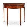 the crossbanded fold-over demilune top inlaid with husk trails and foliate scrolls, opening to a green baize playing surface, above a frieze inlaid with husk swags and raised on square tapered legs ending in spade feet