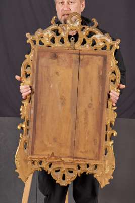 the bevelled plate within frame carved with rocaille work, C-scrolls, and foliate motifs