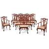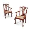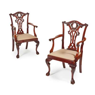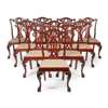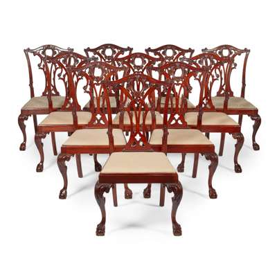 comprising ten side chairs and a pair of armchairs, with serpentine foliate carved crest rails above pierced and carved splats, over drop-in pad seats raised on acanthus carved cabriole legs ending in ball and claw feet