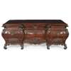 in the manner of Ince & Mayhew, the moulded inverted breakfront top with lobed corners over foliate and scroll carved frieze panels and a bombé centre section, flanked by cupboards and raised on acanthus carved scroll feet, opening at one end to accommodate up to six leaves