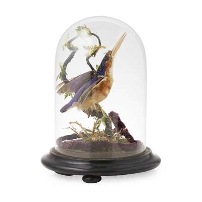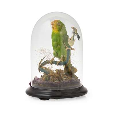comprising a kingfisher and a lovebird, each on branchwork and ebonised stands covered by small glass domes