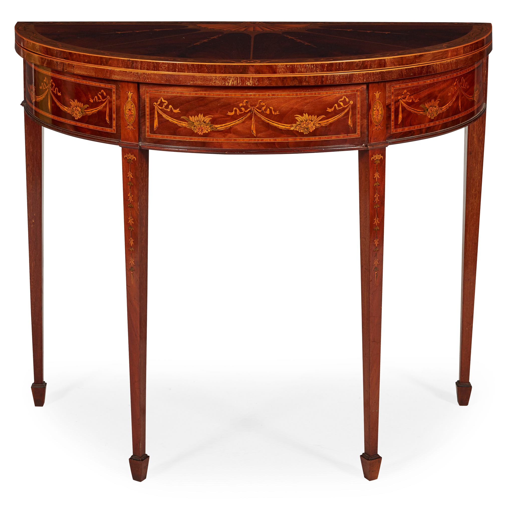 LATE GEORGE III MAHOGANY INLAID DEMILUNE CARD TABLE