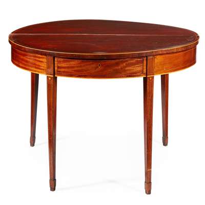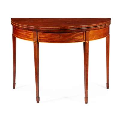 GEORGE III MAHOGANY AND BOXWOOD INLAID DEMI LUNE TEA TABLE