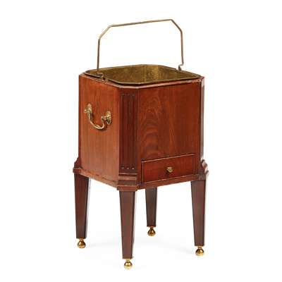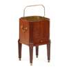 of cubic form with canted fluted corners and a base drawer, with a brass liner and loop handles, raised on square tapered legs on brass ball feet
