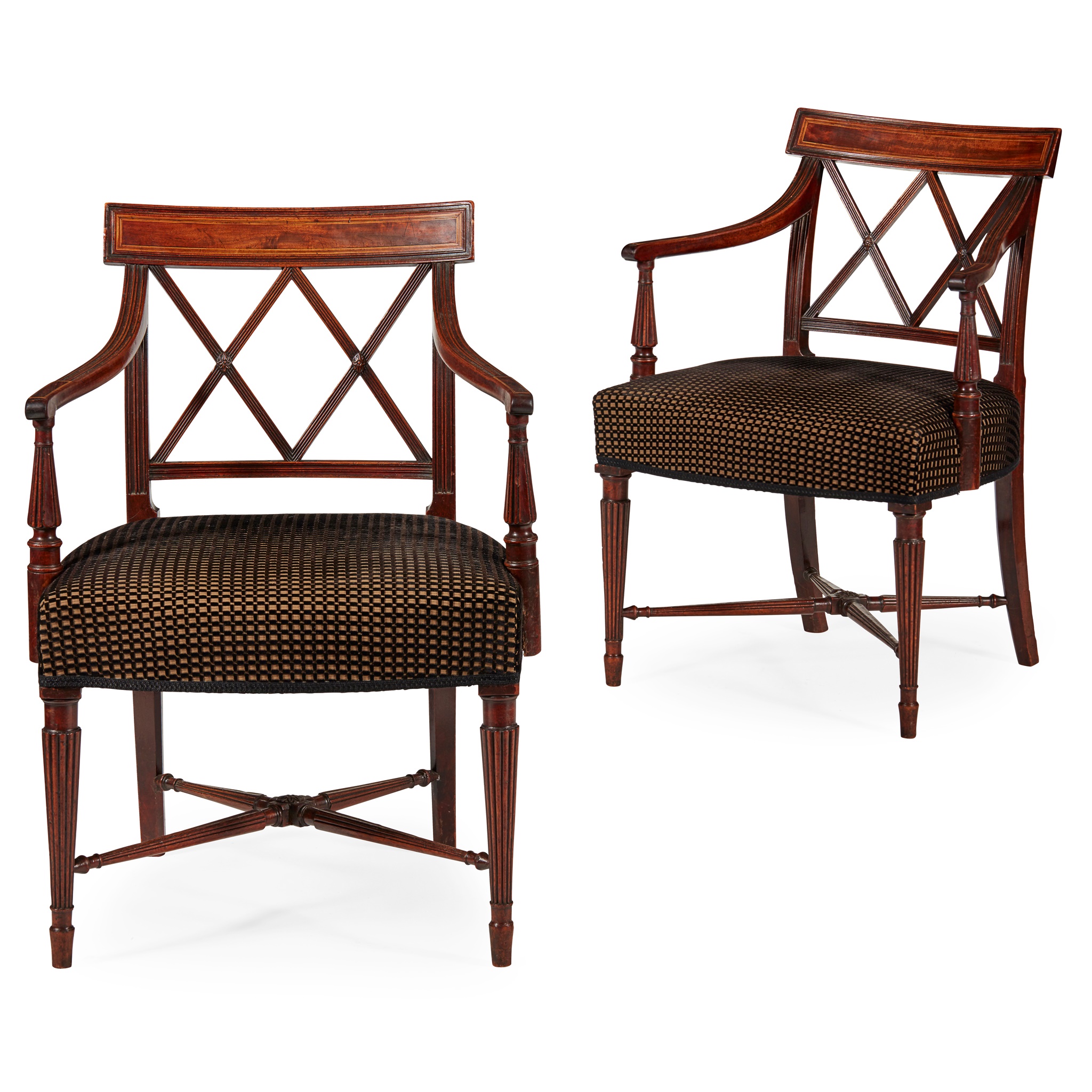 with double X trellis backs above wide stuffover seats flanked by slightly curved arms, raised on reeded tapering legs joined by turned and reeded X stretchers