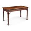 the rectangular top above a blind fret carved frieze, raised on square chamferred legs with corresponding blind fret carving and pierced corner brackets, ending on block feet