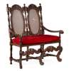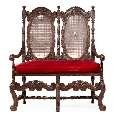 the back with a pair of oval caned panels in a profusely carved frame with turned uprights, acanthus carved downswept arms, and caned seat with a loose cushion, raised on scroll carved legs joined by carved front stretcher
