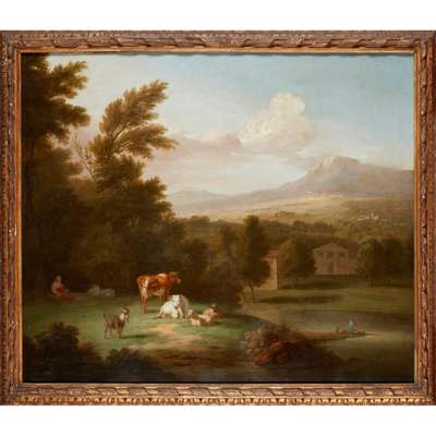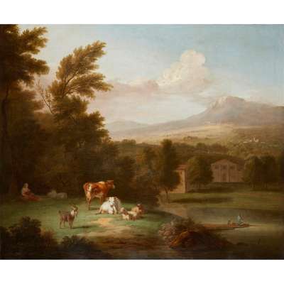 AN ITALIANATE LANDSCAPE WITH SHEPHERDESS TENDING HER ANIMALS