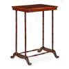the rectangular top with a cockbeaded edge, raised on slender ring turned supports with trestle bases joined by stretcher rails